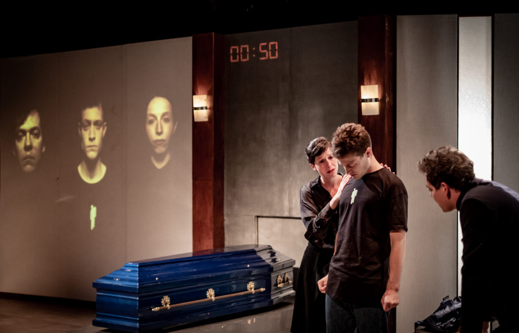 À quoi riment ces rituels minutés, cette lourdeur, cette froideur ? Pourquoi le suicide reste-t-il aussi tabou ? C’est Louis, le plus jeune, l’impétueux Léopold Terlinden qui, à la manière d’une Antigone, avec la fougue de l’adolescence et sa quête d’absolu, vient bousculer l’ordre établi dans ce huis clos autour de la systémique familiale porté par trois comédiens talentueux.