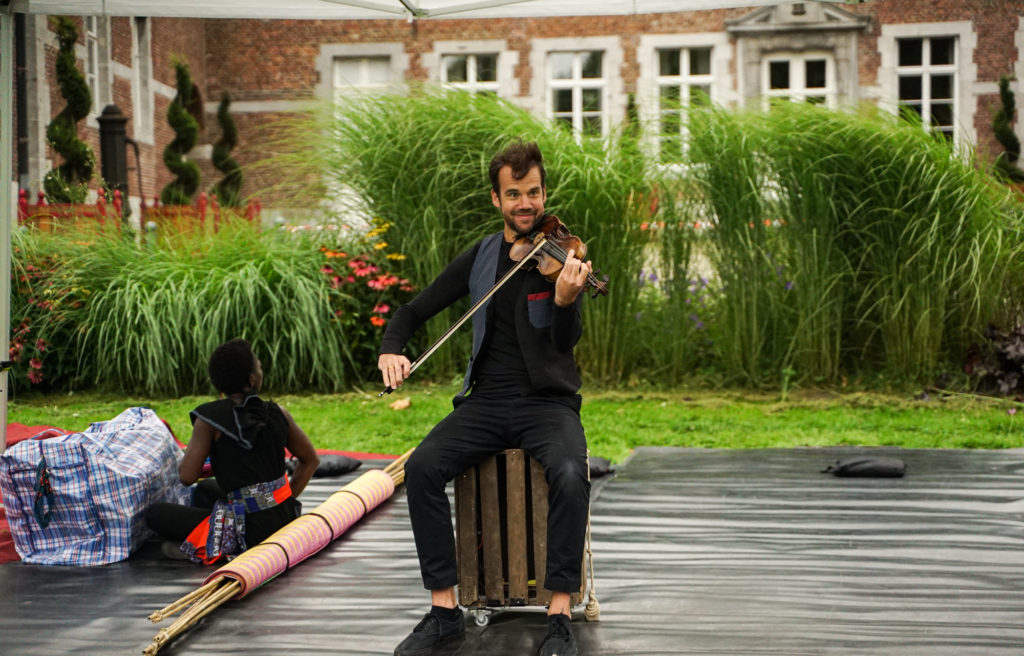 Leur rencontre a lieu après qu’elle ait beaucoup marché. En exil, elle cherche un havre de paix où poser ses petites et grandes affaires pour se reconstruire un nid. Dans ses sacs, elle a emporté les instruments qui lui rappellent les sons et les chants de son pays. Autant de trésors qui font sa richesse. Lui, présent sur sa route, l’accueille et l’accompagne sur ce chemin musical. Comme une comptine qui la rassure. Comme une présence bienveillante et complice.